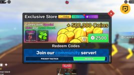 Fish It codes: A screenshot of the Fish It codes box with POCKET TACTICS in it and a PT logo in the top right corner