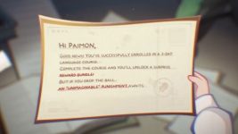 Following this, we got a glimpse of a brief animation showing Paimon’s hand holding up a letter that says, “Hi Paimon, Good news! You’ve successfully enrolled in a 3-day language course. Complete the course and you’ll unlock a surprise reward bundle! But if you drop the ball… an ‘unimaginable’ punishment awaits.”